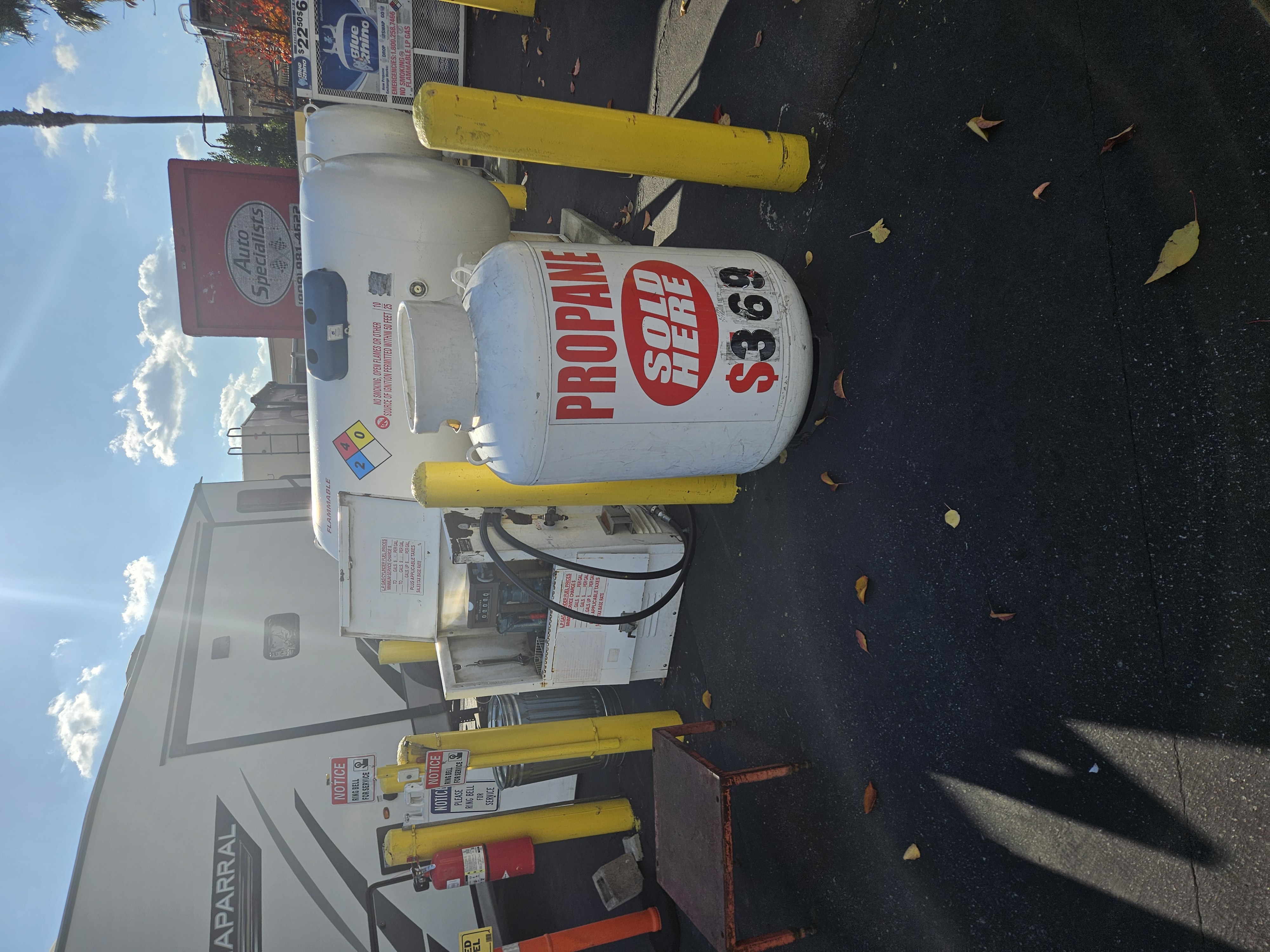 Our propane station is easy access on the west side of our parking lot. All you have to do is pull up and press the attendant button on the yellow pole. Open during business hours Monday thru Friday 8 to 5.